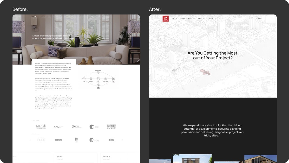 Following launch, the website attracted higher-quality enquiries from serious homeowners and developers, aligning with Urbanist’s goal of pursuing larger, higher-budget projects. Traffic remained strong due to SEO continuity, but the audience shifted to clients with more complex needs. Internally, the redesign was seen as a major step forward for the brand, better reflecting its ambition and positioning Urbanist as a premium practice within a competitive market.